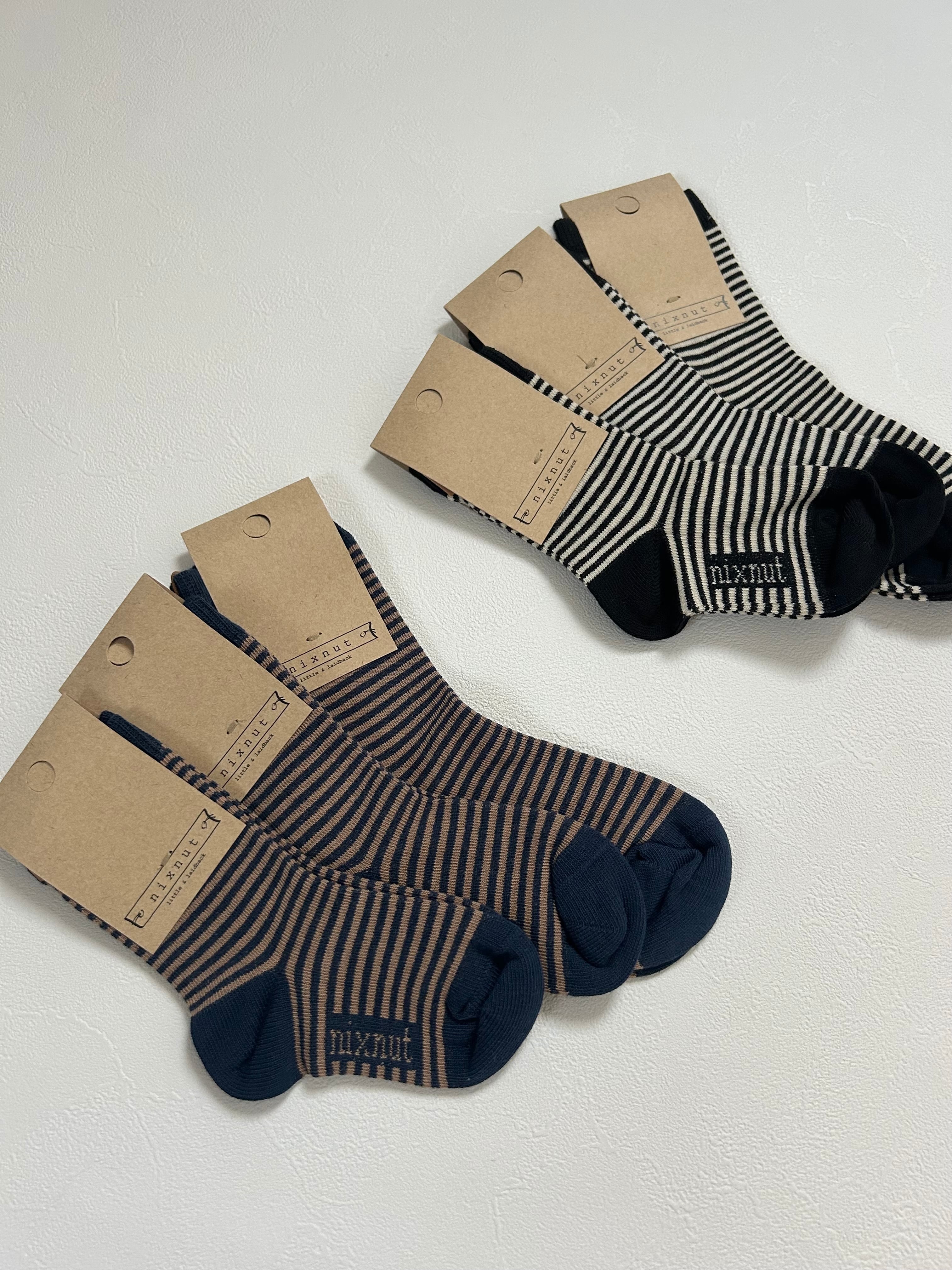 とても柔らかいオーガニックコットン素材、ネイビーとブラウンベージュのオシャレなカラーが魅力のショート丈のソックスです。履き口のブランドタグもコーディネートのアクセントになりますよ。