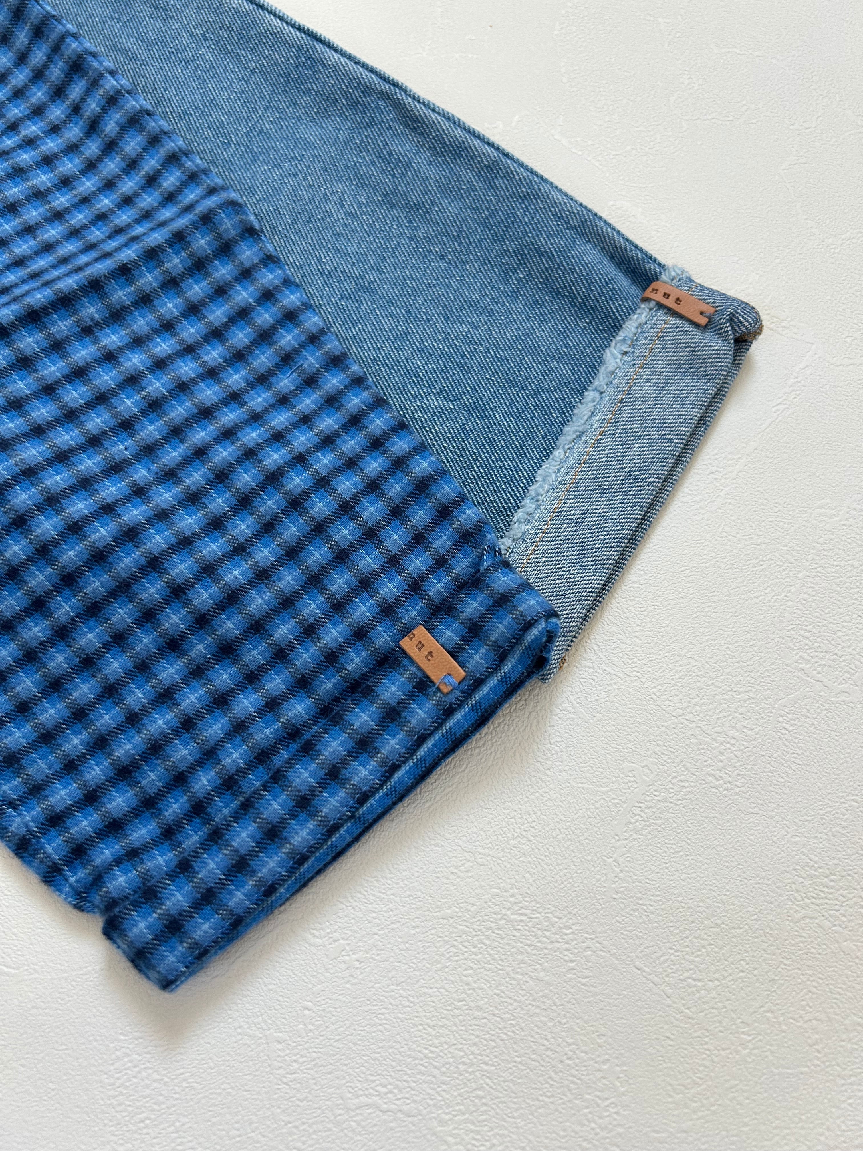 タイムレスな太めのシルエット。ウエストゴムで履きやすく、股上が深めで動きやすい仕様です。裾は、フリンジ加工されており、アクセントのブランドタグがあります。大きめサイズをロールアップで履いてもかわいいです。