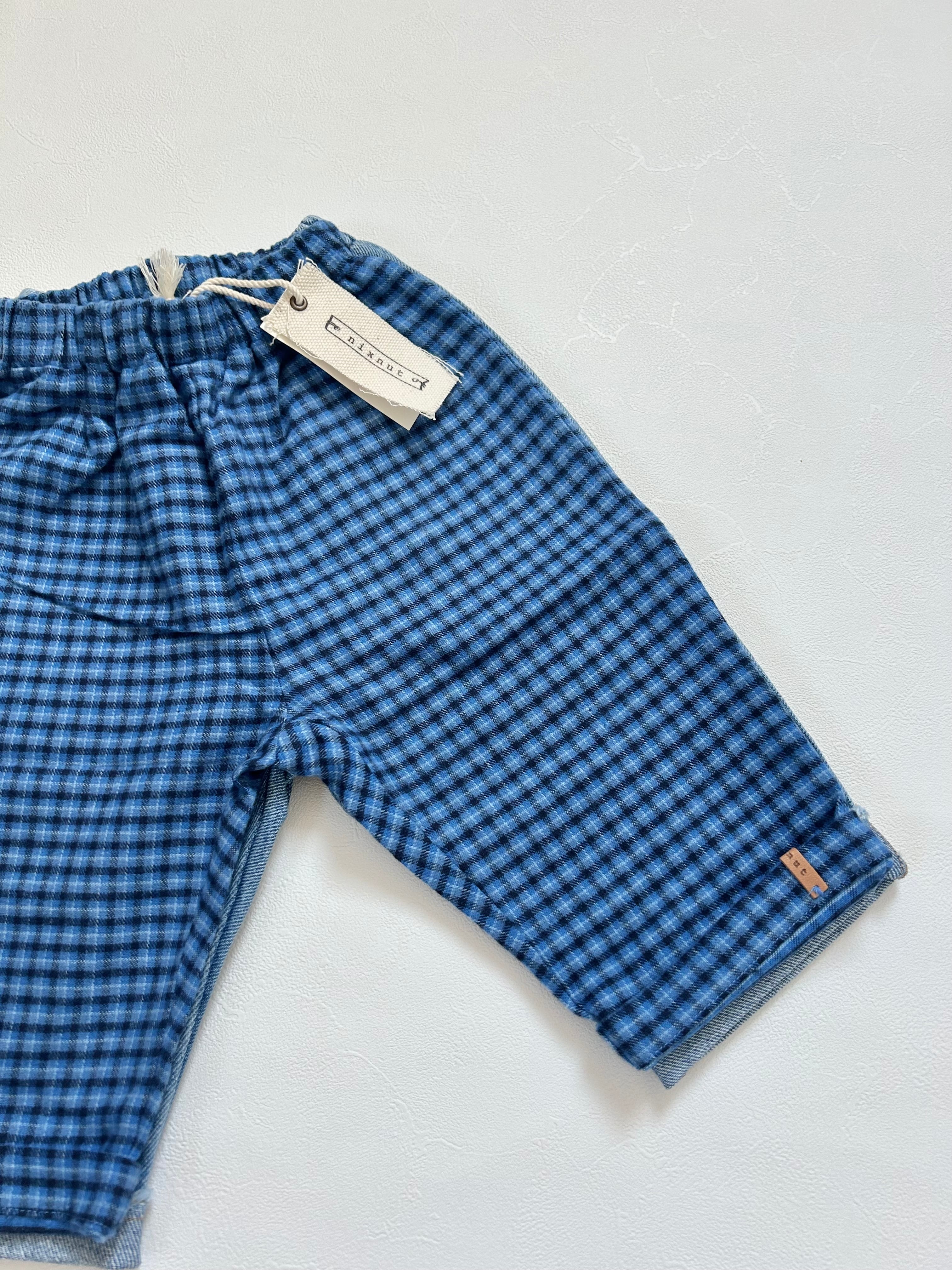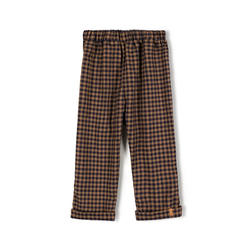 タイムレスな太めのシルエット。ウエストゴムで履きやすく、股上が深めで動きやすい仕様です。裾にはアクセントのブランドタグがあります。大きめサイズをロールアップで履いてもかわいいですよ。