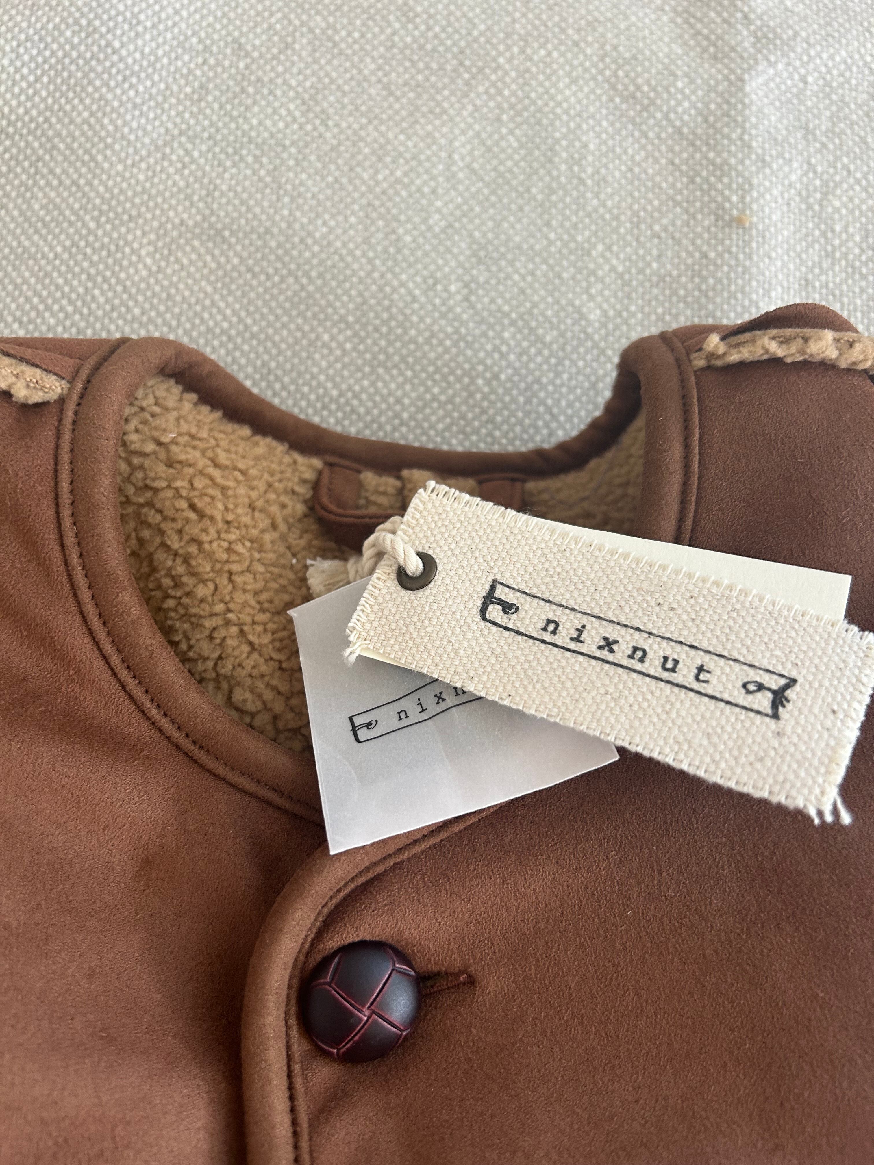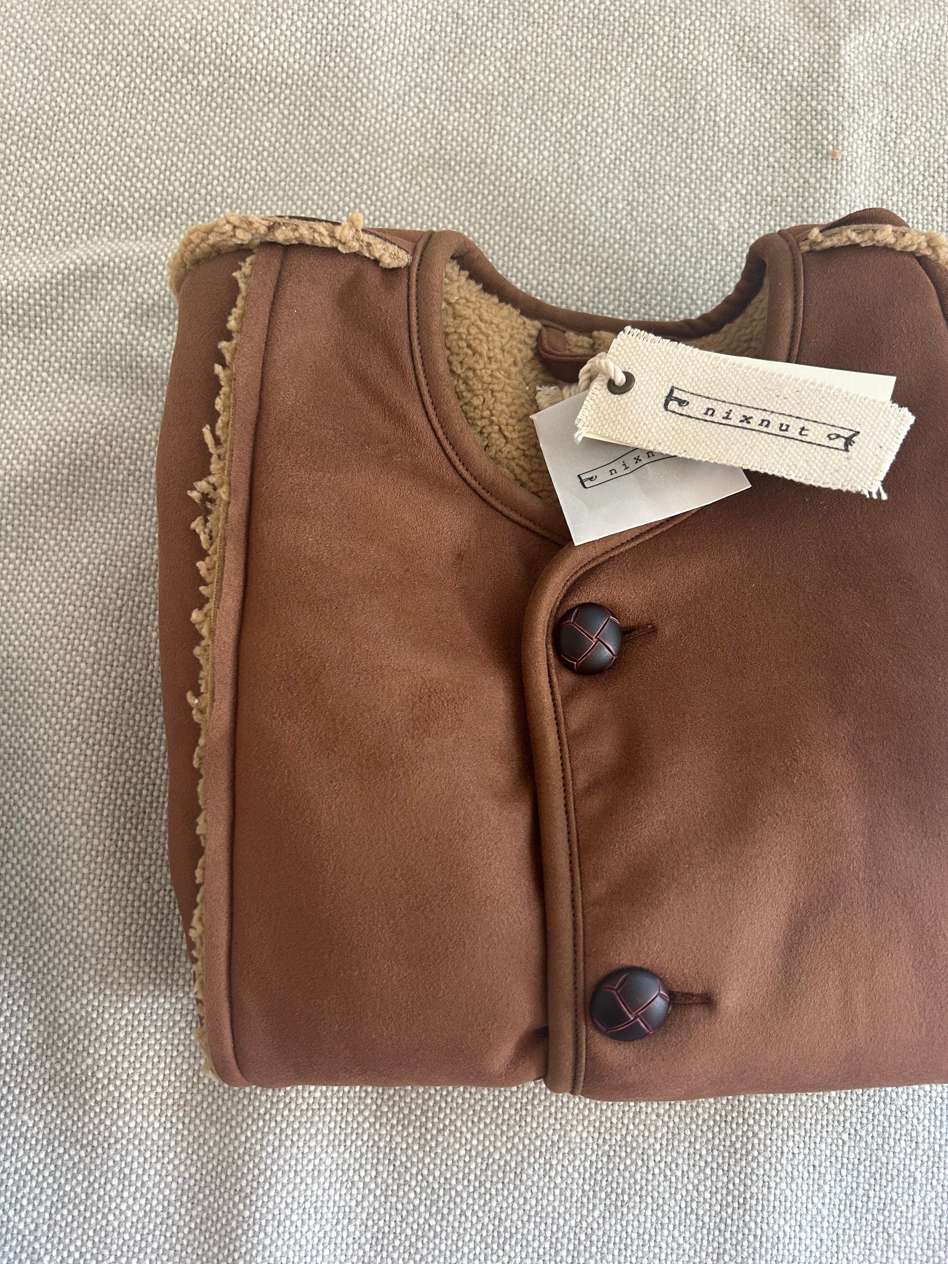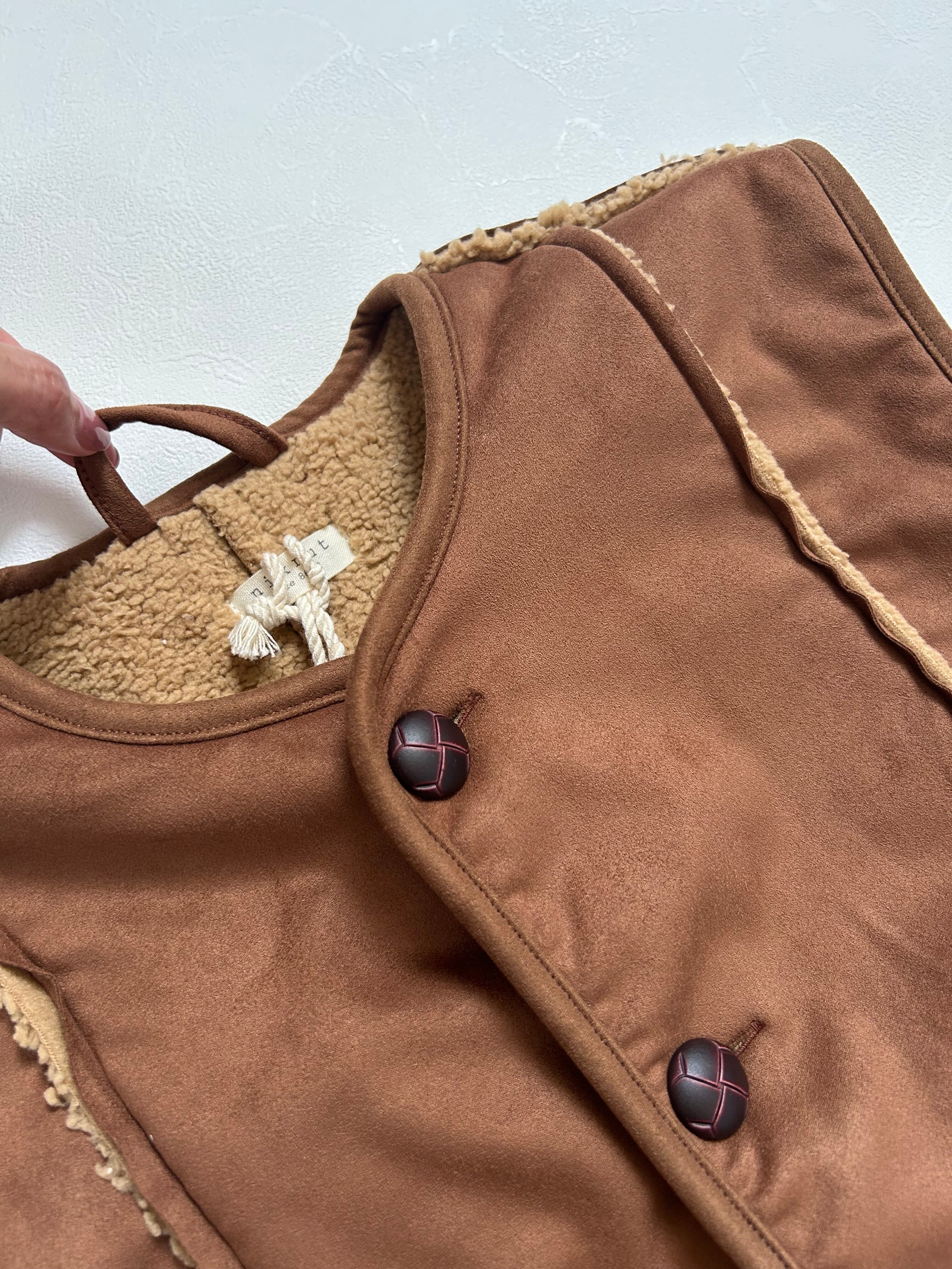 秋冬のコーディネートにぴったりの暖かみのあるキャラメルカラーです。外側はエコスウェード、内側はふわふわのボアでとても暖かいです。エコレザー製なので軽くて、お洗濯も可能です。首の内側には、引っ掛け用のループがあるのでお出掛けの際に便利です。ブランドタグは、背中側の首元に縫い付けてあり後ろ姿も素敵ですよ。