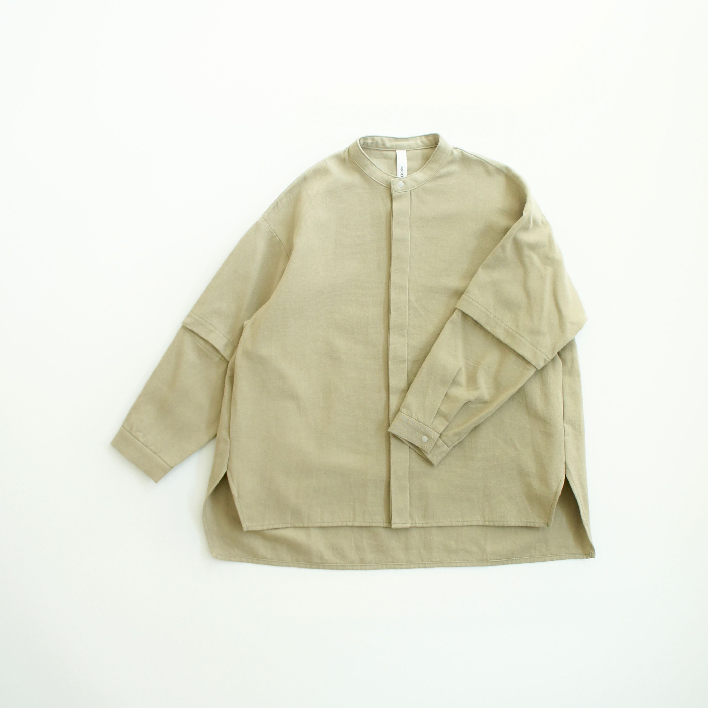 袖をの肘から下を取り外すことができ、まだ暑い初秋は半袖、涼しくなってきたら長袖と、1枚2役で着用可能です。また、取り外し部分を少し開け、スリットの様にしたスタイリングも楽しめます。