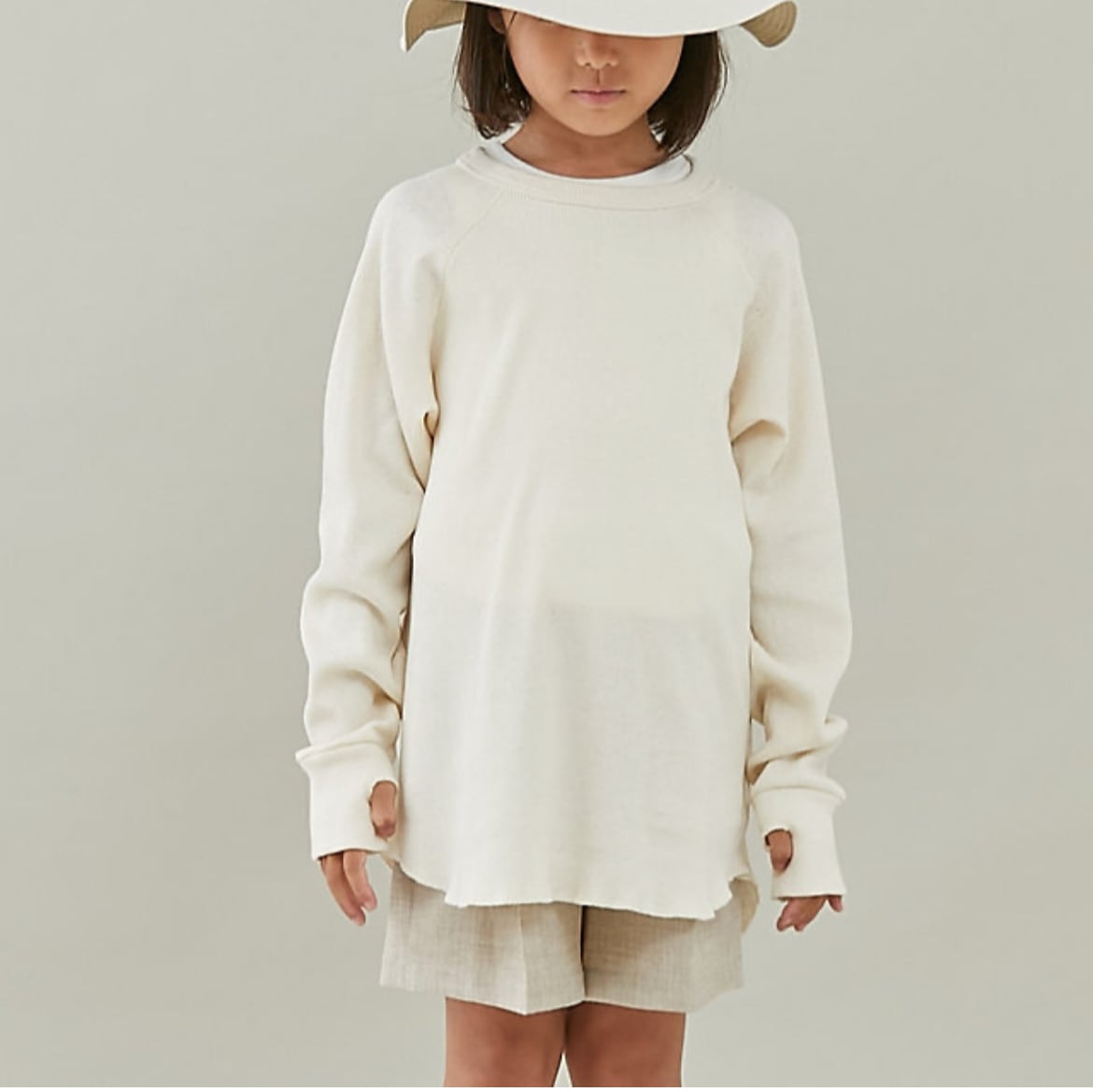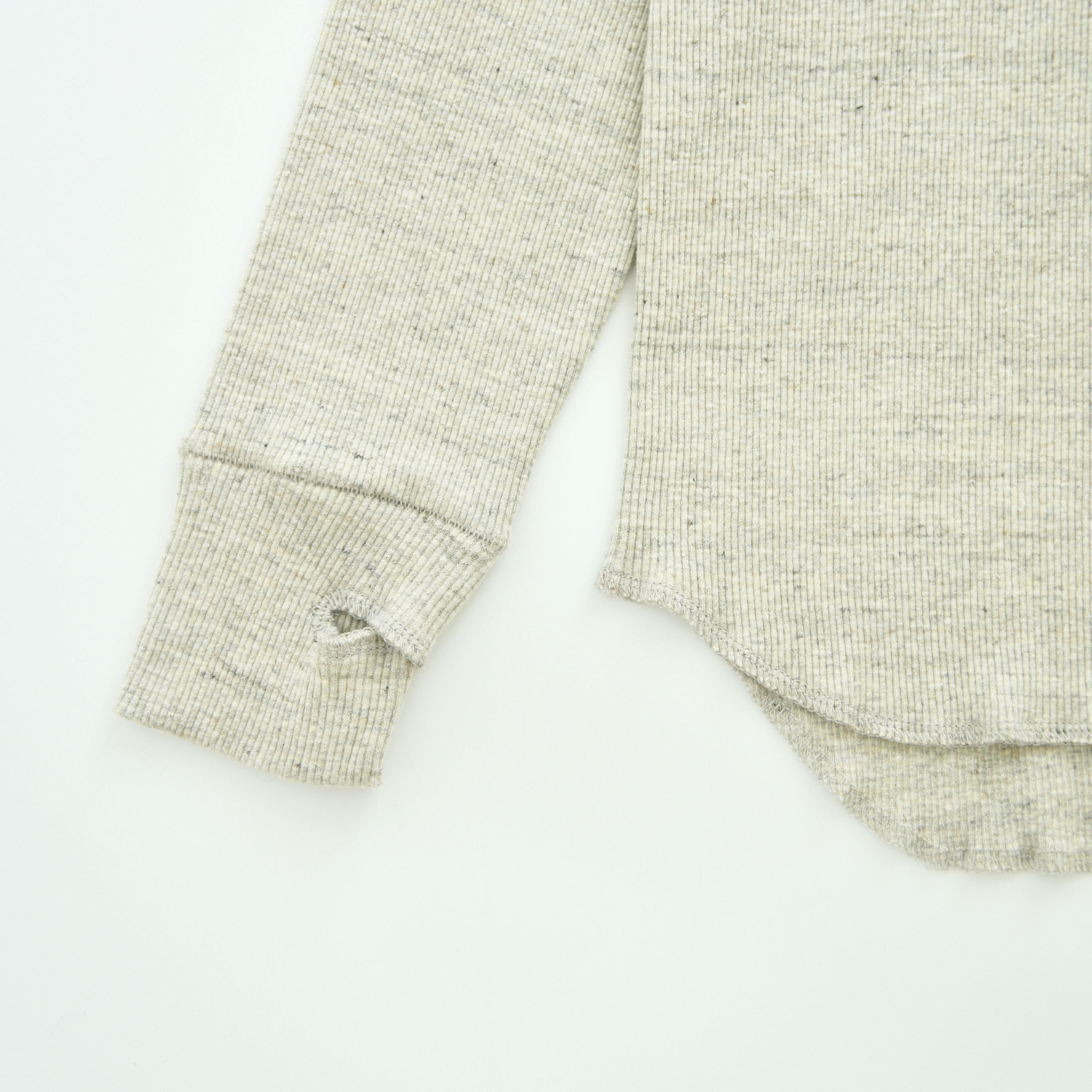 ソフトで独特な色味が特徴のリブロングスリーブTシャツ。生産工程で出てしまう余分な綿(落ち綿)を混ぜた粗挽き糸を使い、独特なムラがある色味と、ソフトな風合が特徴のリブを使用。スッキリとした縦長シルエットで、リブ地のソフトな風合いがリラックス感を出しています。袖口にサムホールあり。