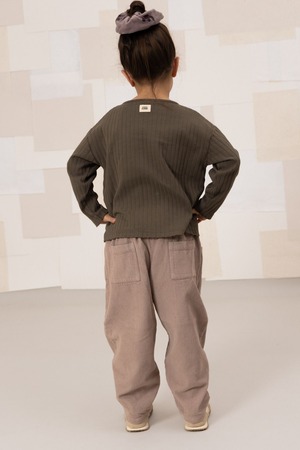 シーズンカラーの『LIGHT MAUVE』の優しくくすんだモーブカラーが素敵です。短め丈と丸みのあるシルエットが動きやすく、毎シーズン大人気のボトムスです。柔らかなオーガニックコットン100%のコーデュロイ素材と伸縮のあるウエストゴムにより、かわいいシルエットを作り出しています。