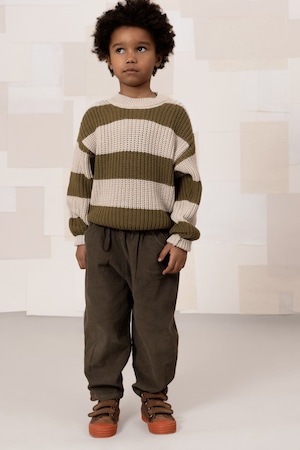 シーズンカラーの『DARK TAUPE』の深みのある温かなトープカラーが素敵です。短め丈と丸みのあるシルエットが動きやすく、毎シーズン大人気のボトムスです。柔らかなオーガニックコットン100%のコーデュロイ素材と伸縮のあるウエストゴムにより、かわいいシルエットを作り出しています。