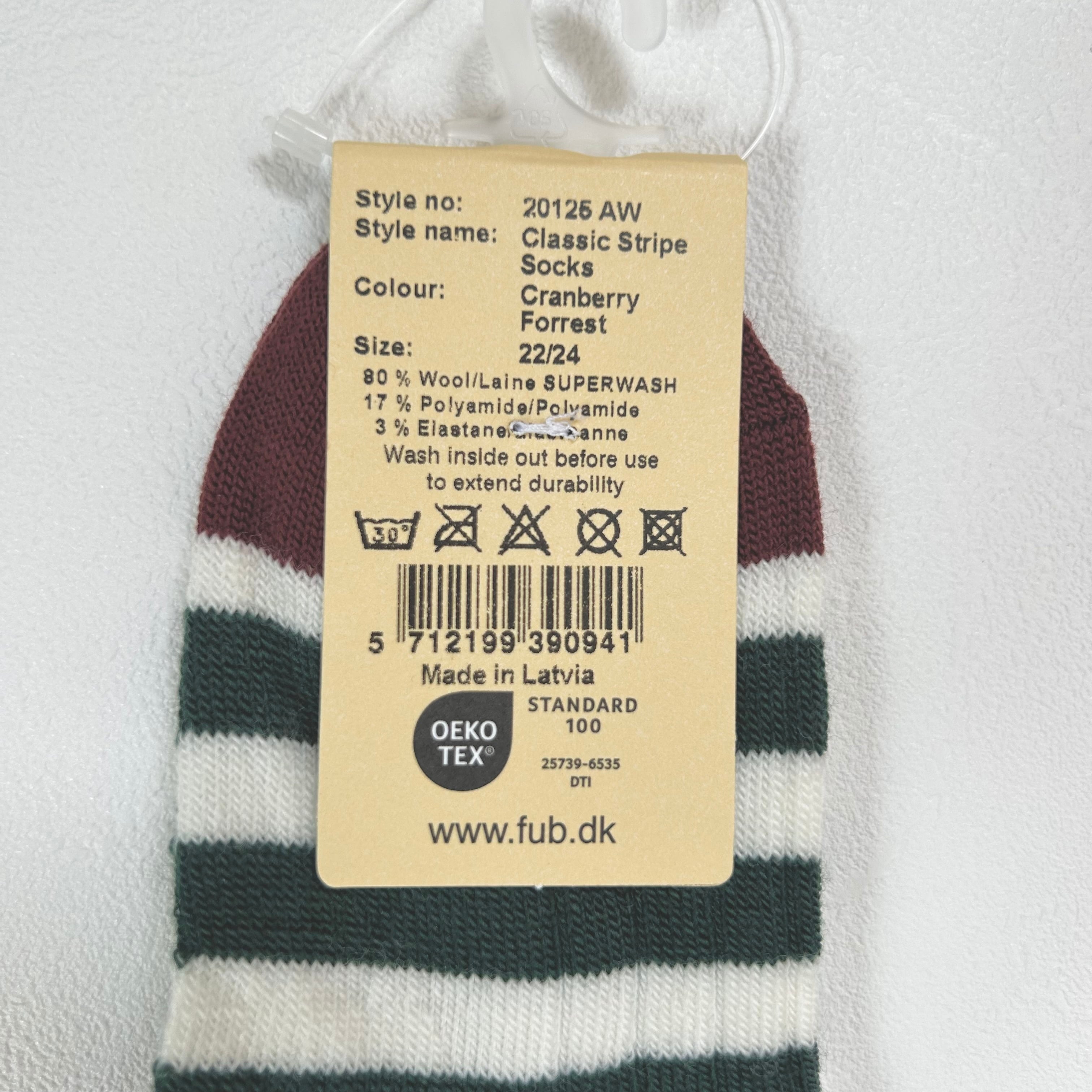 ウールの靴下。クラシックなリブ質感とボーダーが足元のアクセントとなります。使いやすいモスグリーンとホワイトのボーダーをベースに、踵とつま先、履き口には赤みブラウンを施したデザインが特徴です。シンプルながらも細やかなカラーバランスがコーディネートを引き立ててくれます。
