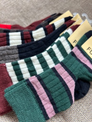 ウールの靴下。クラシックなリブ質感と太めのボーダーが足元のアクセントとなります。モスグリーンをベースに、ピンクとダークネイビーのボーダー柄、踵とつま先にもダークネイビーを施したデザインが特徴です。シンプルながらも細やかなカラーがコーディネートを引き立ててくれます。