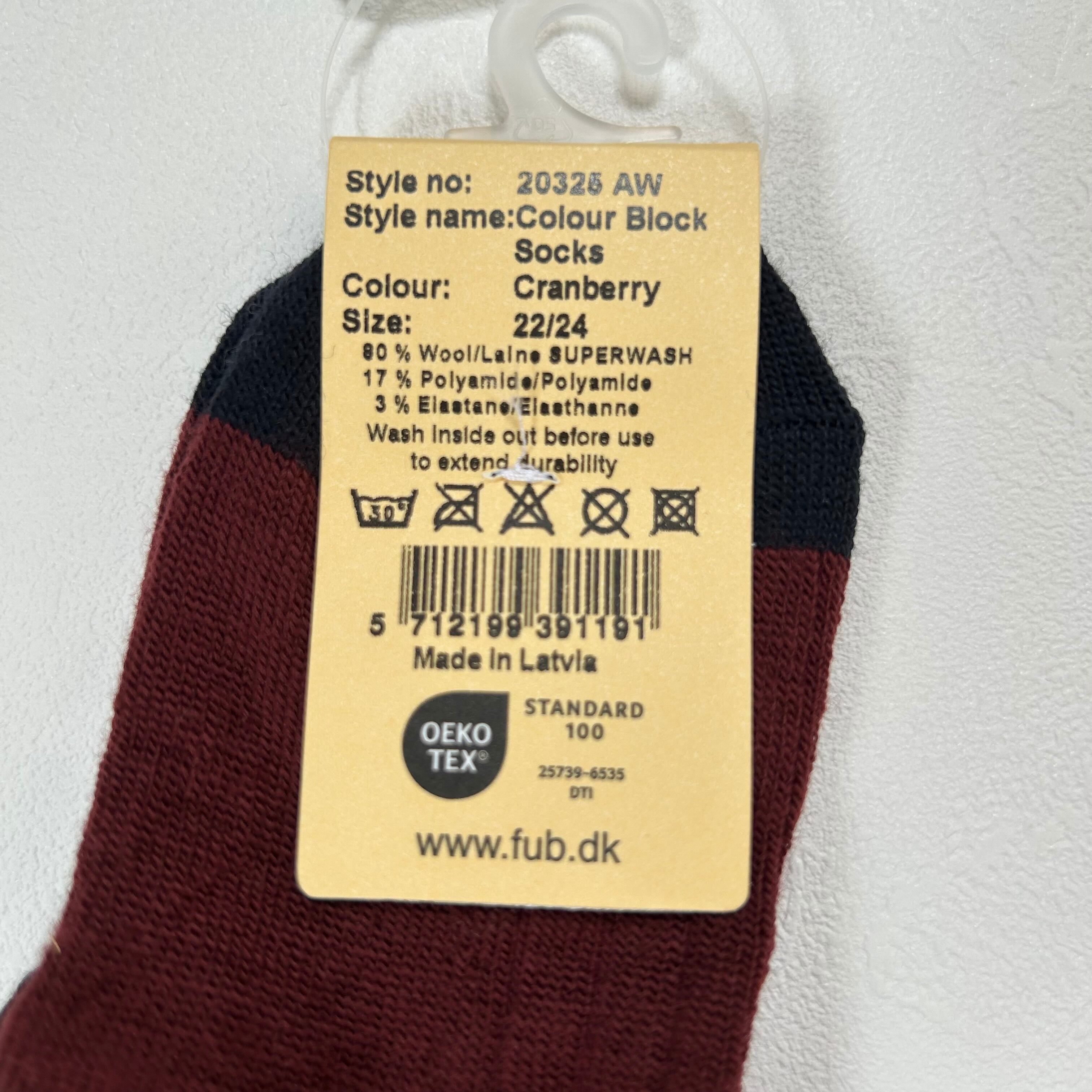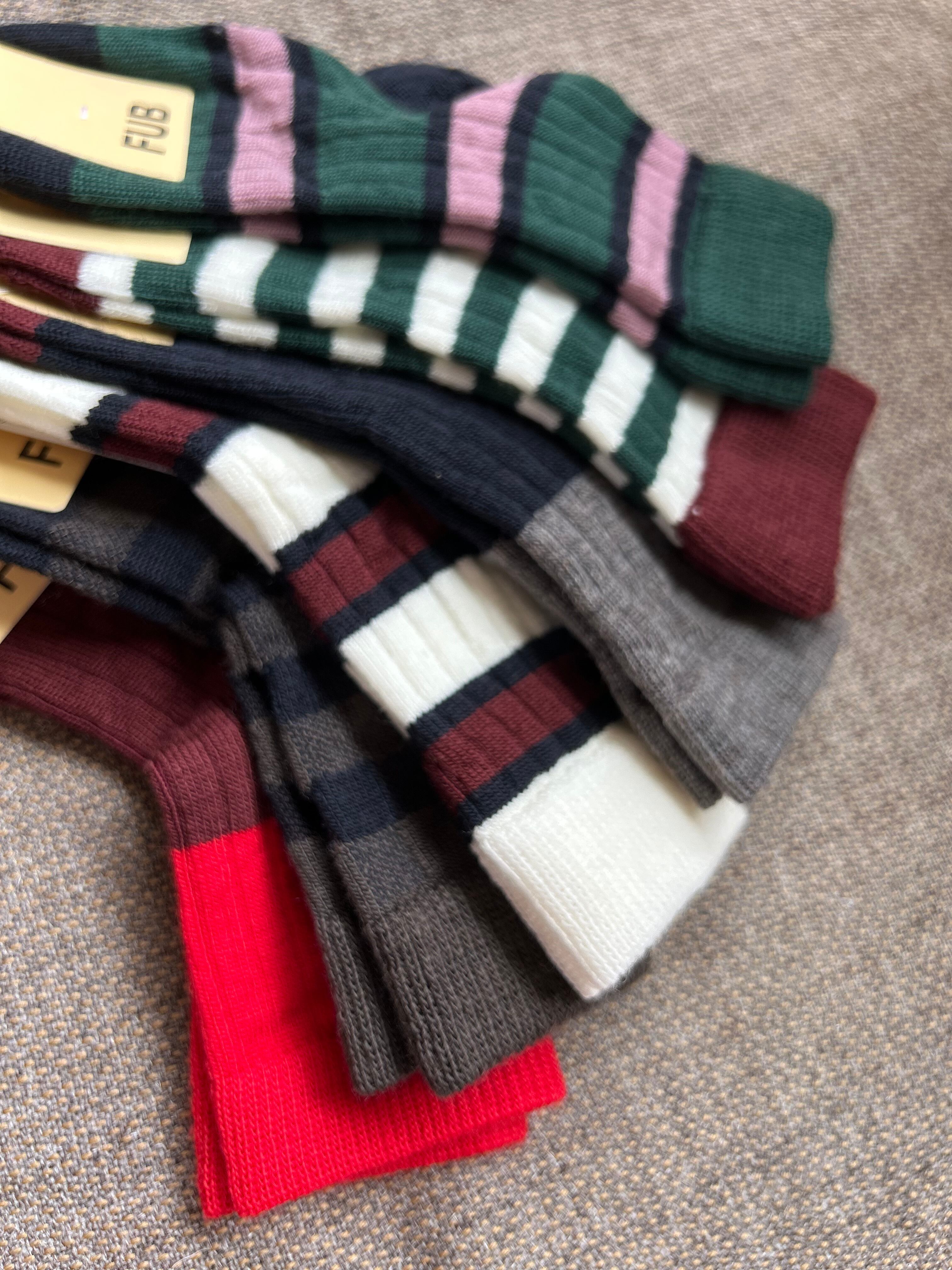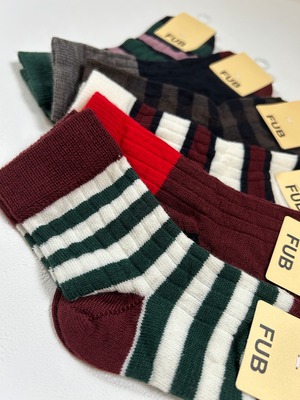 ウールの靴下。クラシックなリブ質感とカラーブロックのデザインが足元のアクセントとなります。鮮やかなレッド、ダークレッド、踵とつま先にはダークネイビーを施したデザインが特徴です。シンプルながらも細やかなカラーがコーディネートを引き立ててくれます。