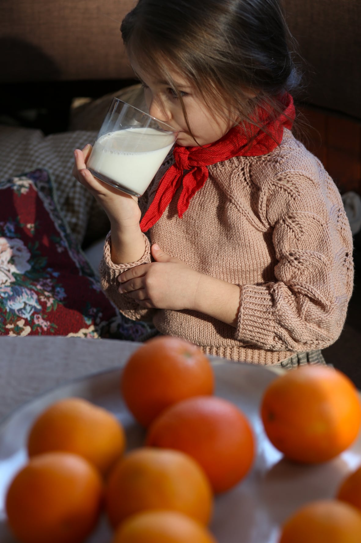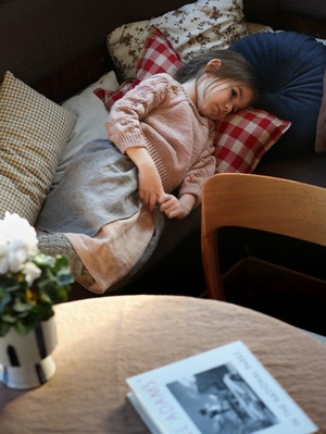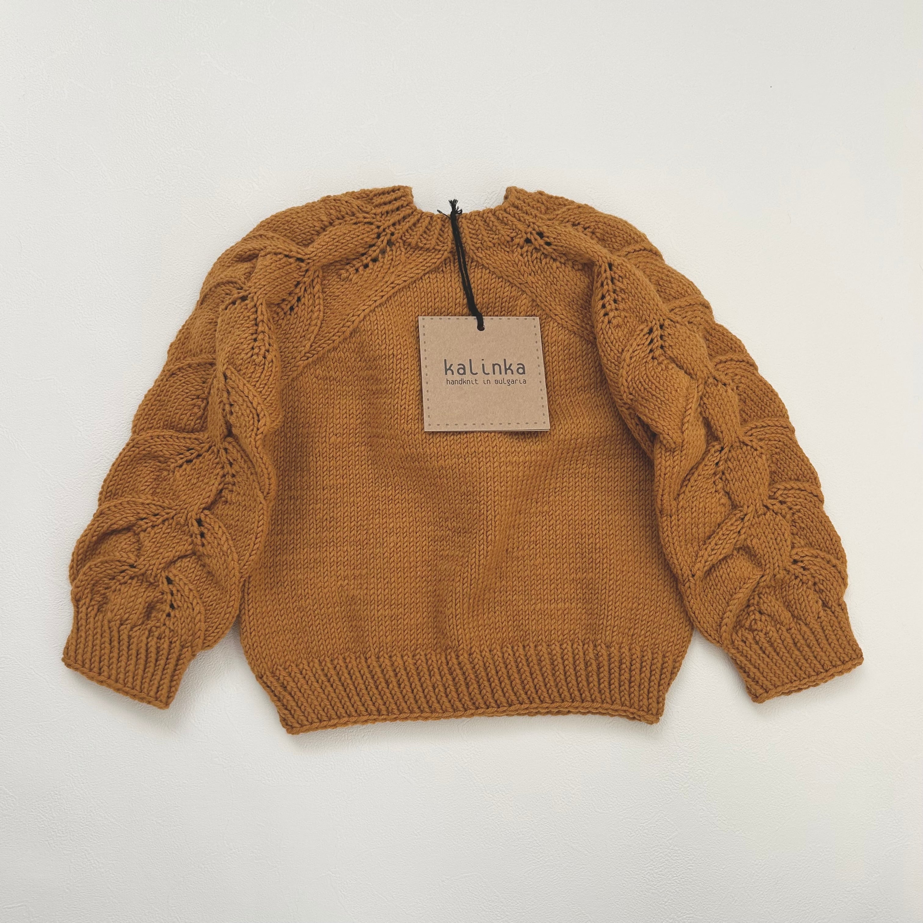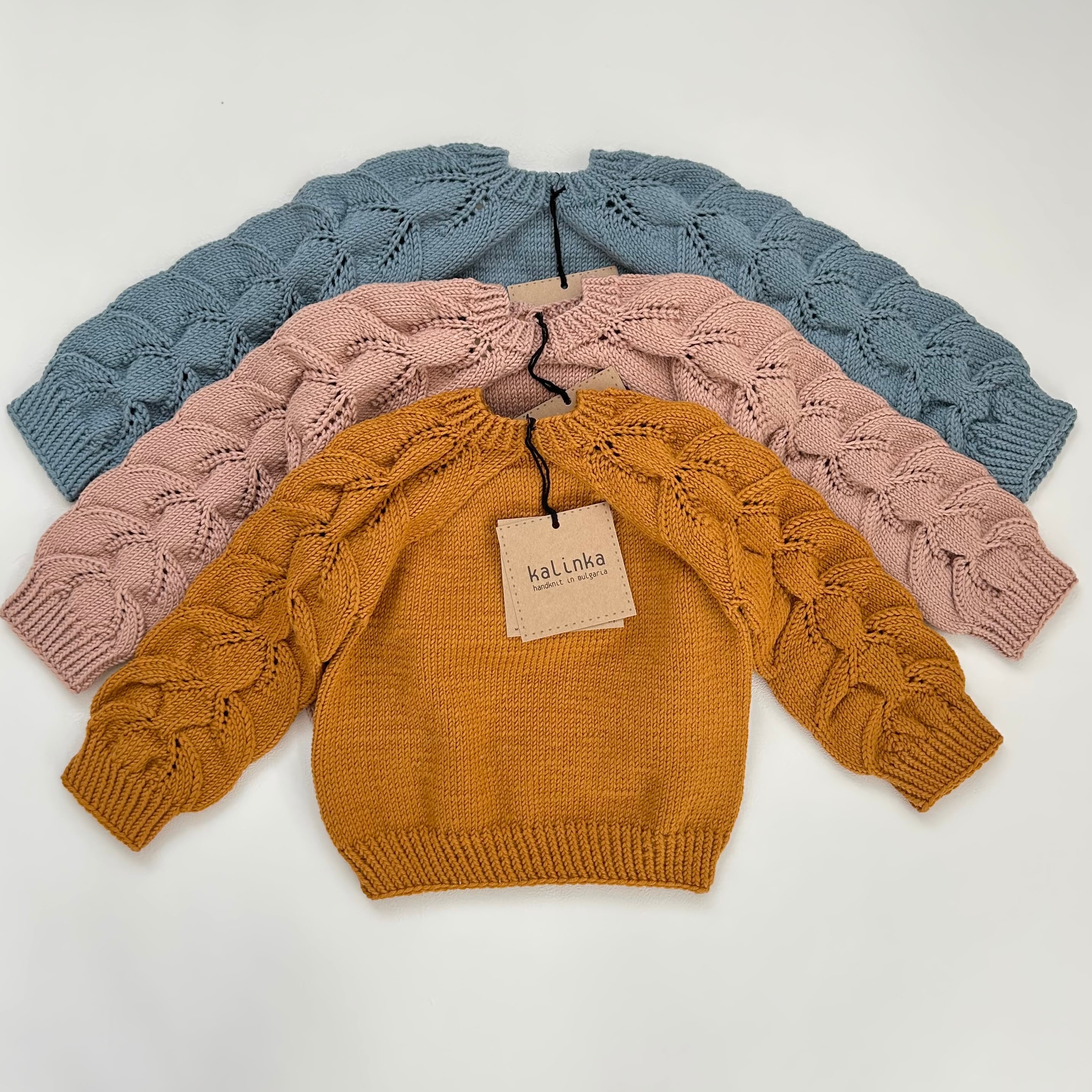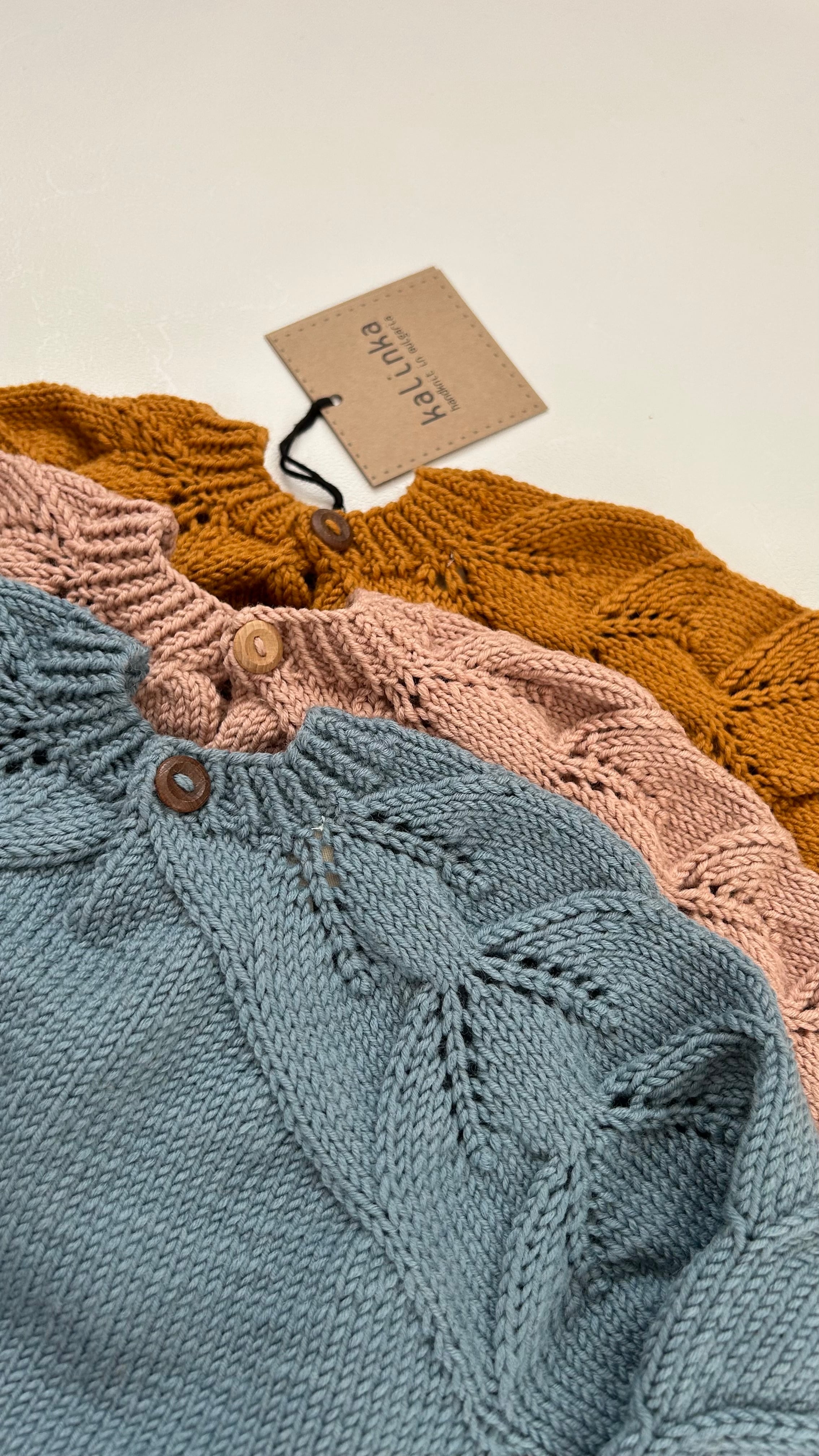 袖全体が編み目模様となった新作のセーターは、シンプルながらも特別感があります。単色なので、コーディネートしやすいです。今シーズンは、カリンカらしい魅力的な3色をご用意しました。優しい「くすみピンク」、爽やかな「くすみブルー」、そして深みのある「キャラメル」。背面ボタンの色もそれぞれ異なり、色合いへのこだわりを感じられます。