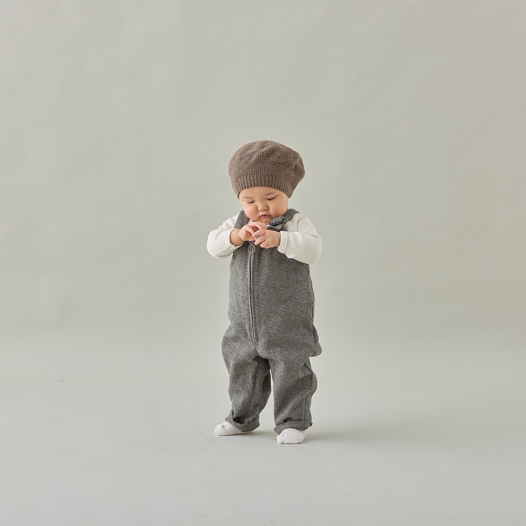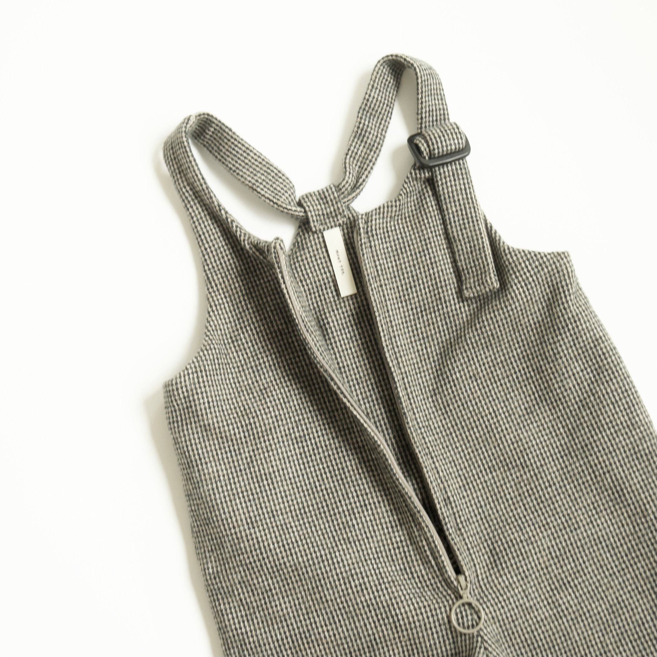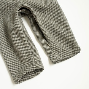 MOUN TEN.ではおなじみのサロペットを、ベビーサイズに落とし込みました。ウールの様な雰囲気ながらチクチク感のない、ソフトな肌触りのコットンツイードを使用ツイードの優しい色味と温もりのある素材感で、レトロな印象になっています。フロントが大きく開くファスナー開きで脱ぎ着がしやすく、左肩のアジャスターのみで長さを調節可能です。