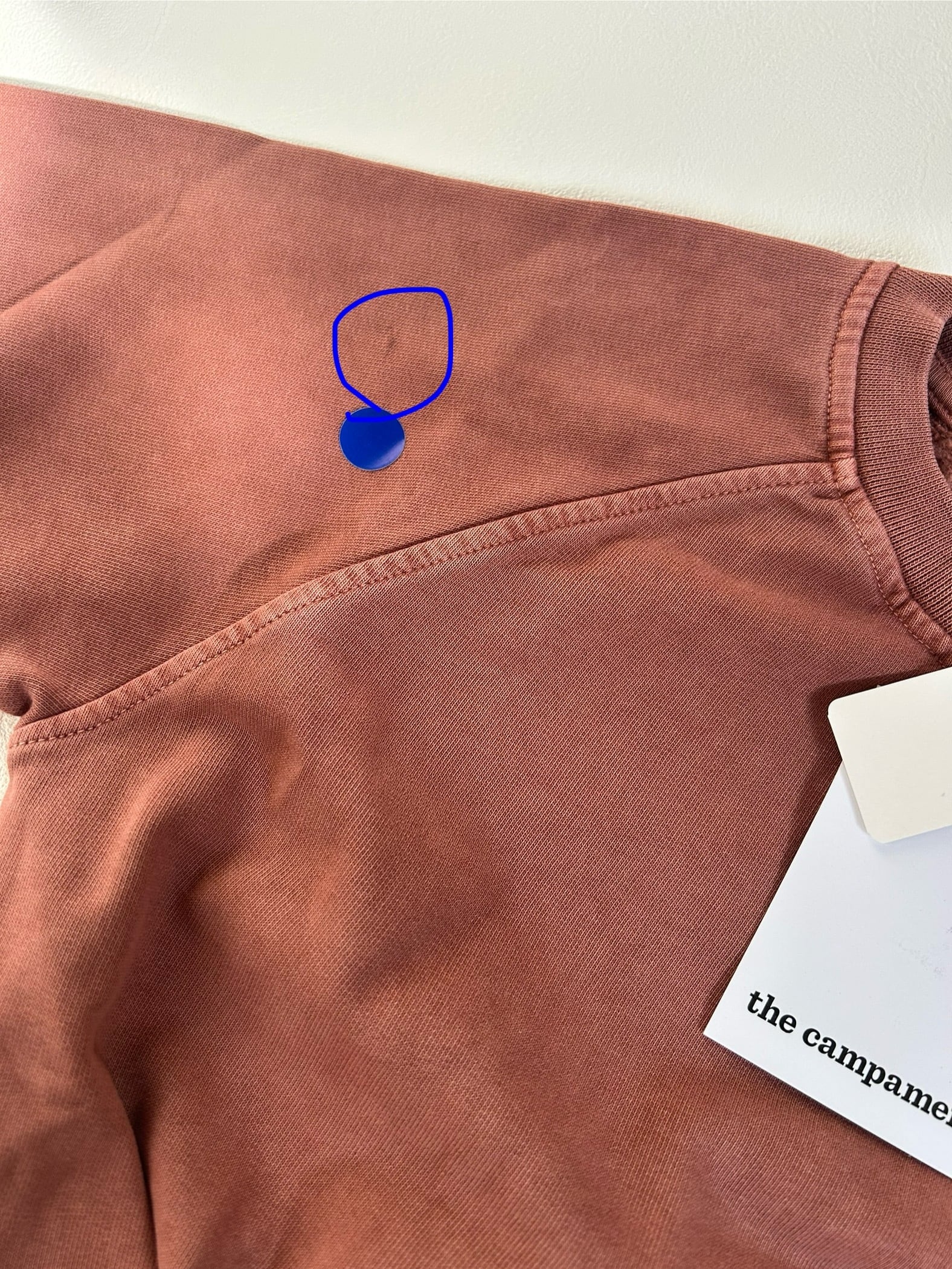 3枚目の写真掲載のとおり、肩の背中側に暗い色の染めムラがございます。シミ取りで取れる可能性もありますが、風合いのためshopでは洗濯処理をしておりません。