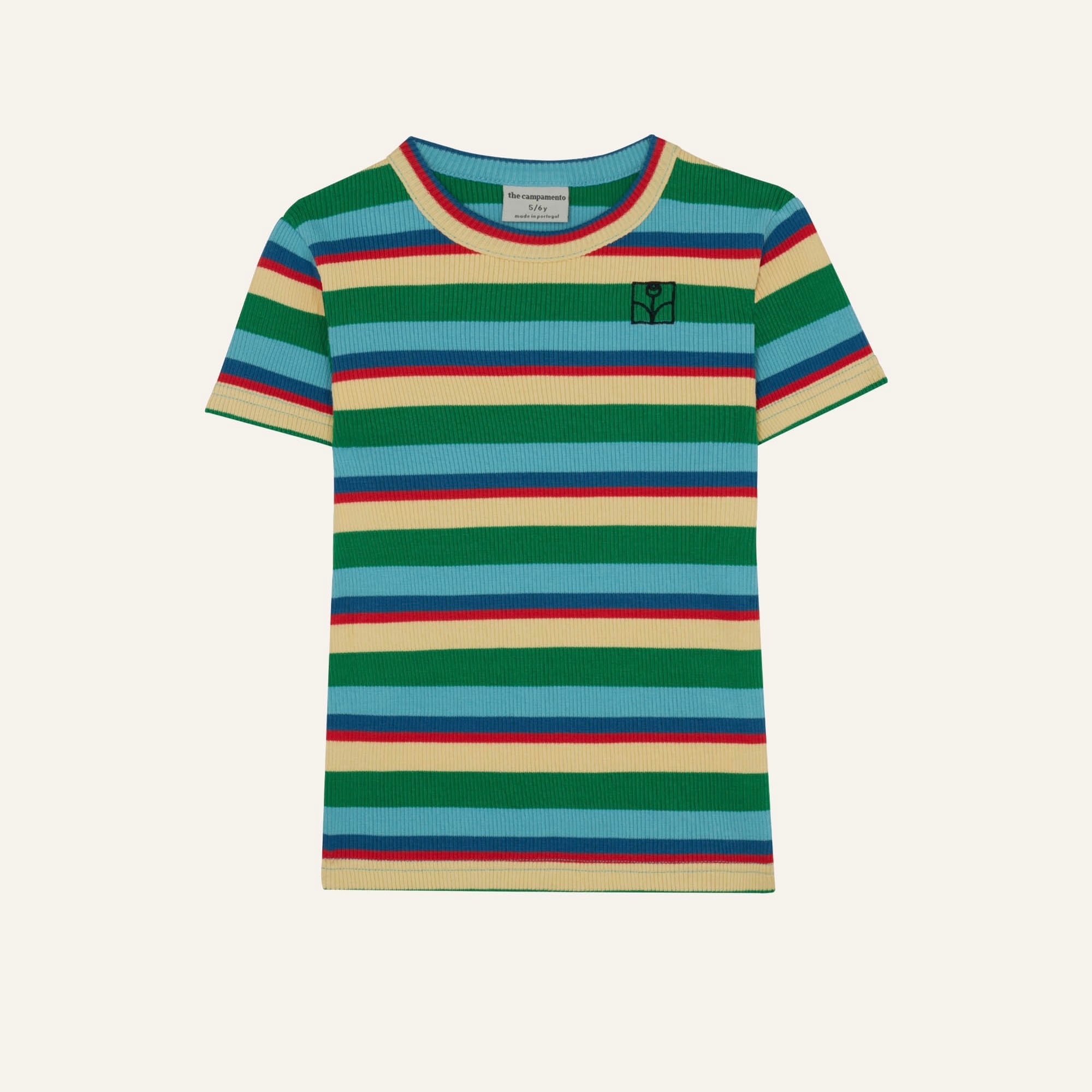 ファンの多いカンパメントのリブシリーズ。洗ってもくたびれない生地と、よく伸びて身体にフィットする着心地がとにかく人気です。マルチカラーのボーダーが、春夏らしく元気なコーディネートが作れるれる配色です。