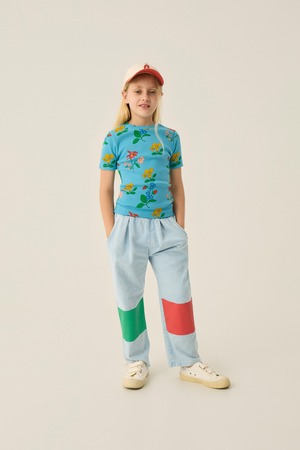 きれいなブルーをベースに、カラフルなお花柄がかわいいです。よく伸びて身体にフィットするので着心地良いです。青空の下にピッタリの春らしく元気なアイテムです。