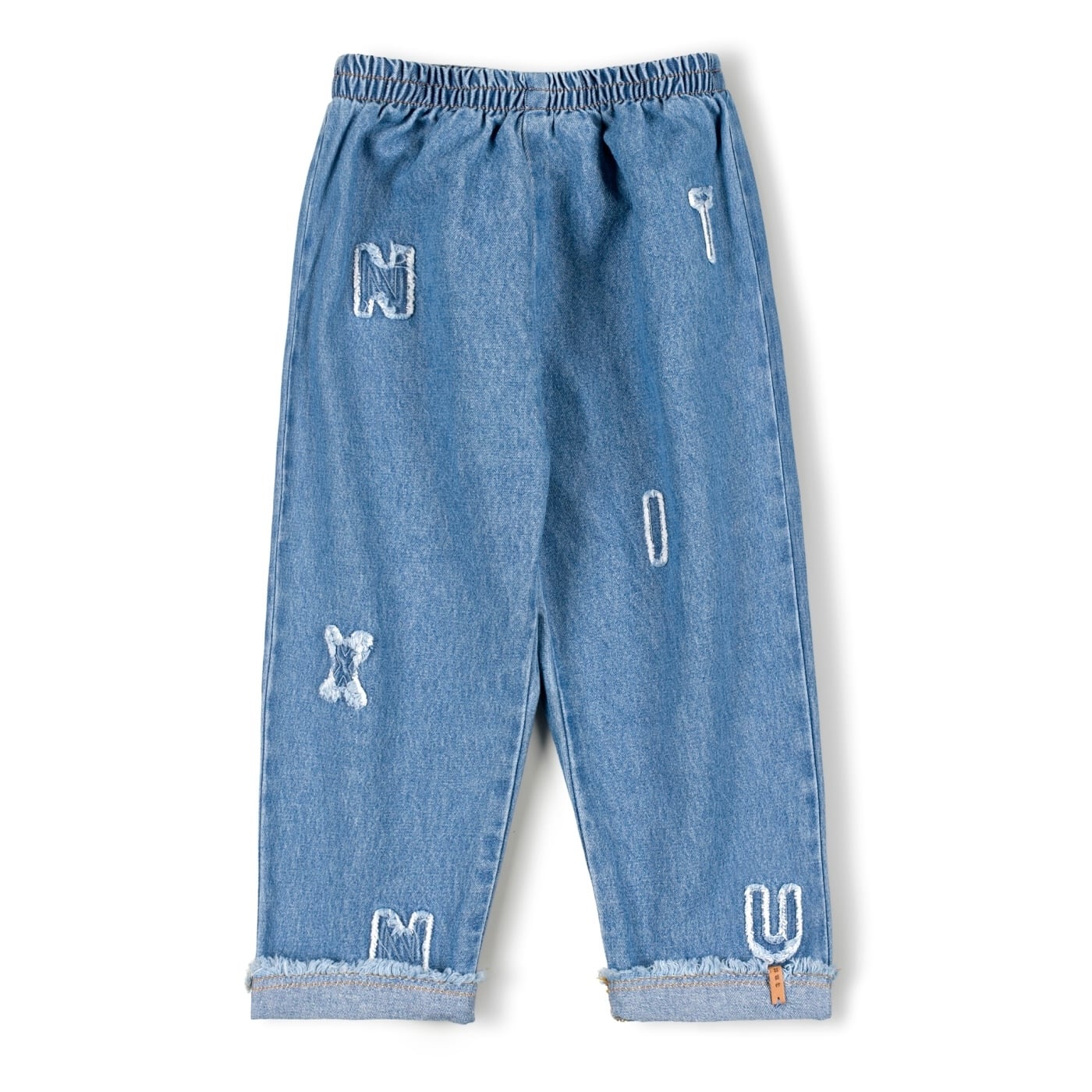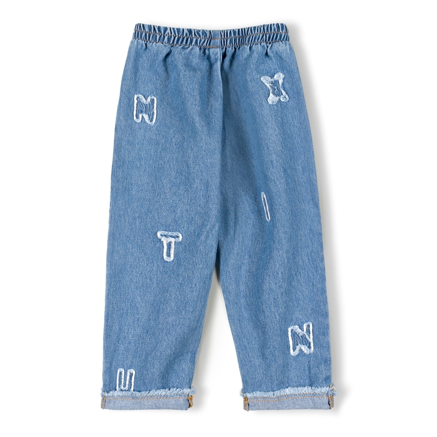 タイムレスでユニセックスな太めのシルエット。ウエストゴムで履きやすく、股上が深めで動きやすい仕様です。全面に「nixnut」のアルファベットが散りばめられた特徴的なデザイン。裾は、フリンジ加工されており、ブランドタグがアクセントに。大きめサイズをゆったりとロールアップで履いてもかわいいです。