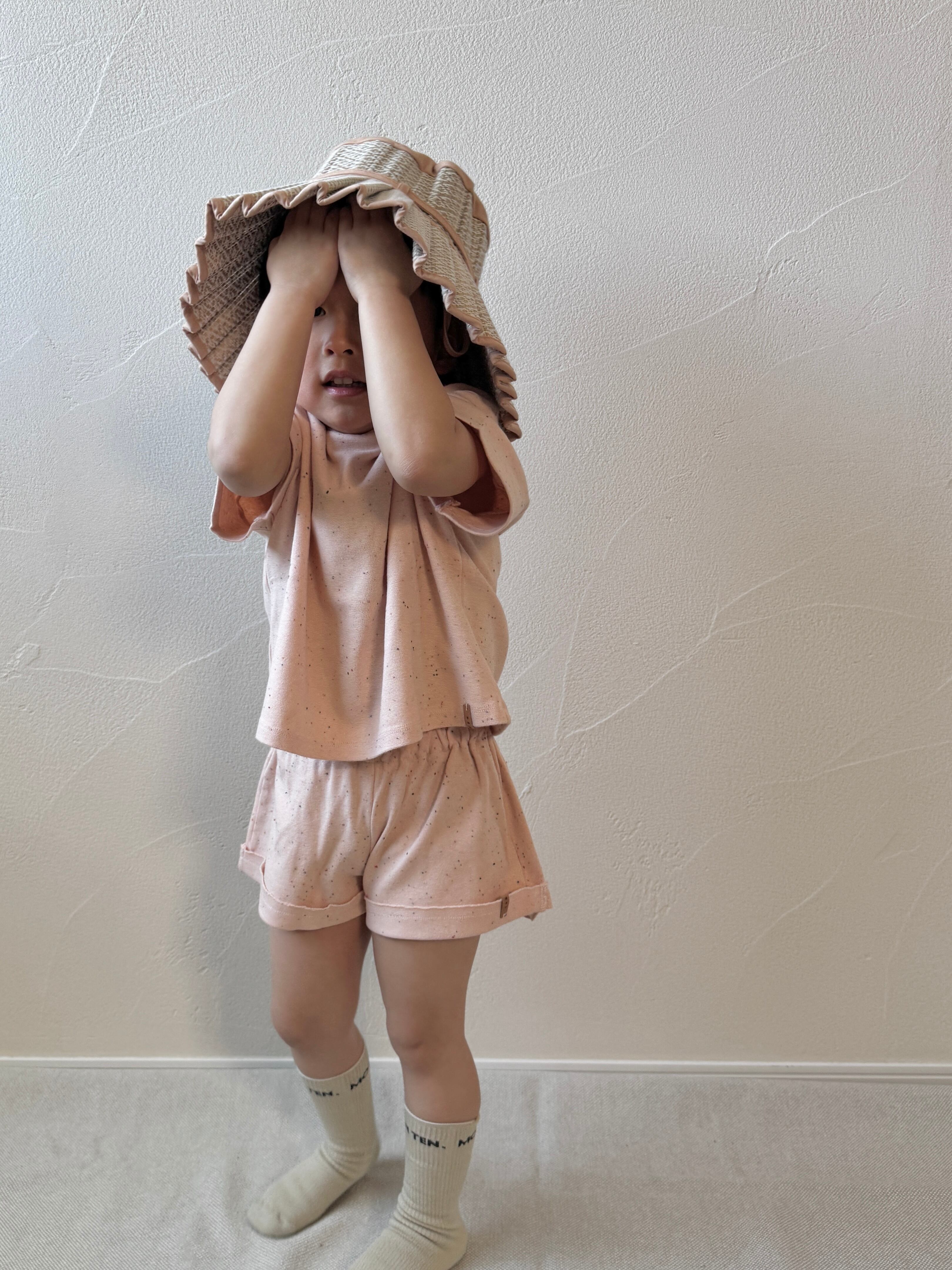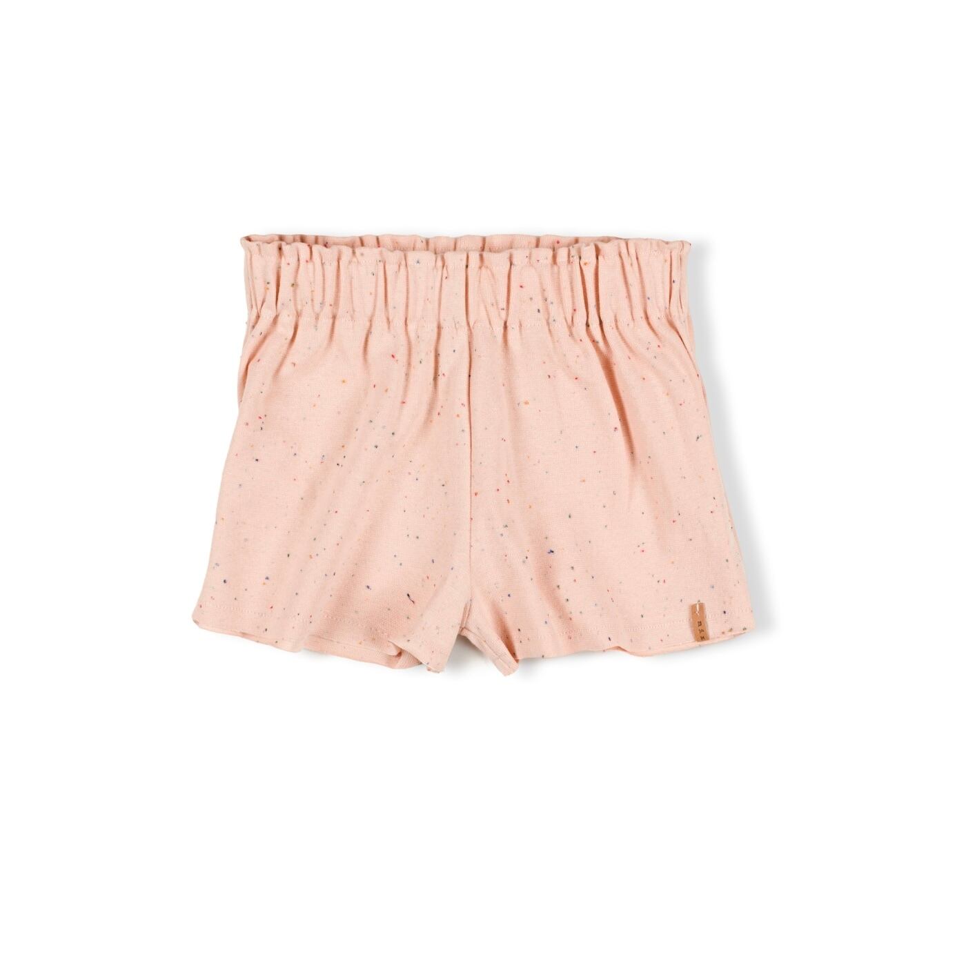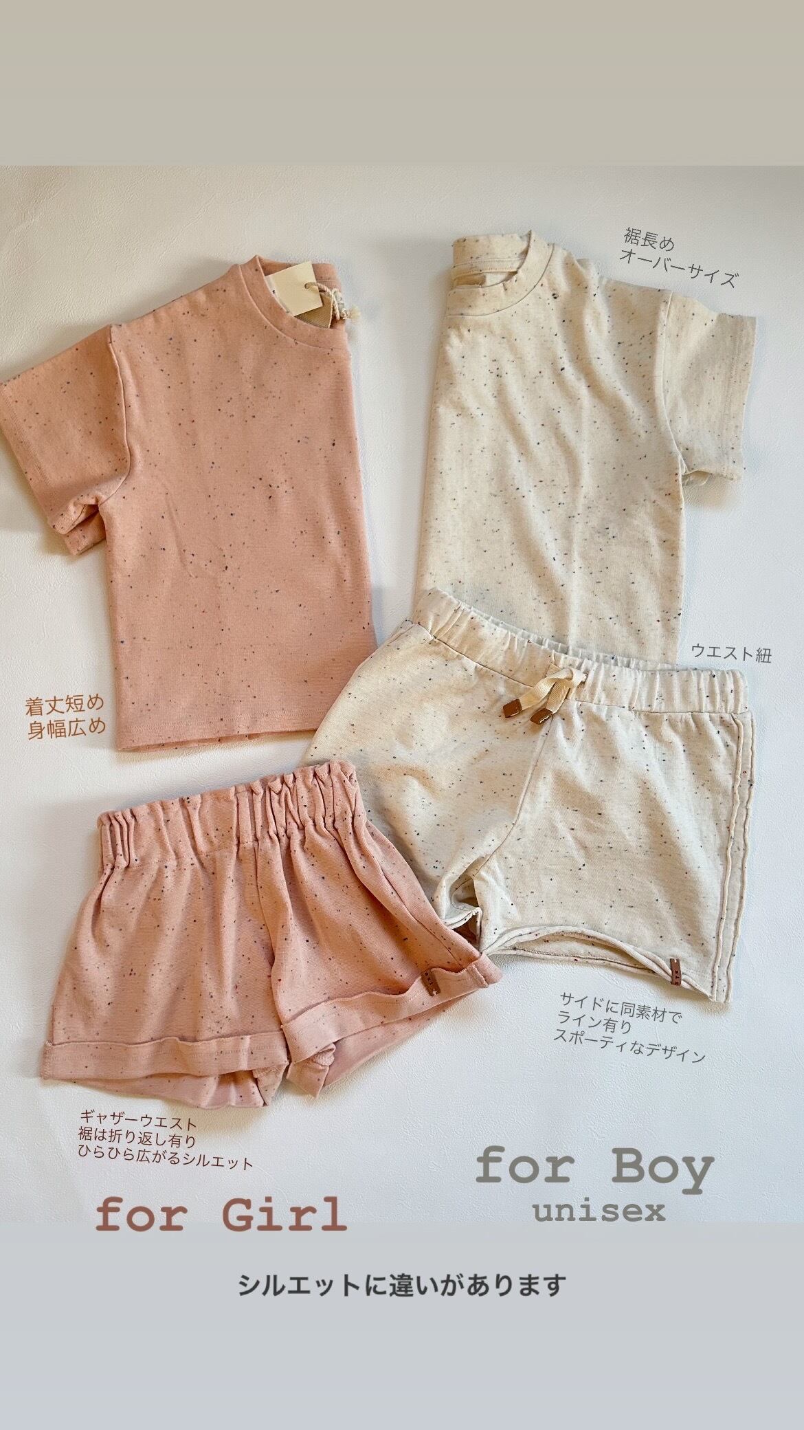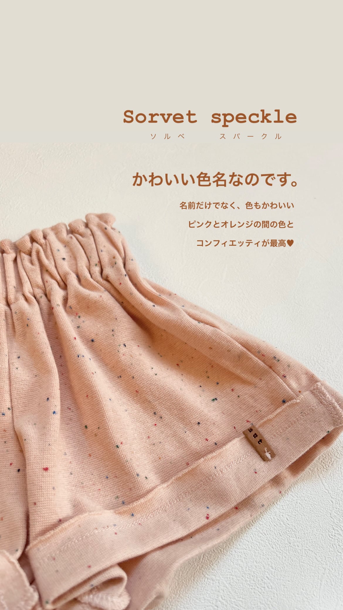 肌触りが最高なオーガニックコットン素材です。淡いピンクのソルベカラー生地に、カラフルなコンフィエッティのつぶつぶがかわいいです。出荷時は、ロールアップのデザインなので更にショート丈ですが、折戻して少し長めに着てもかわいいです。お揃い生地のTシャツとのセットアップもかわいいですよ。上質でこだわりの詰まったアイテムは、ギフトにもぴったりです。