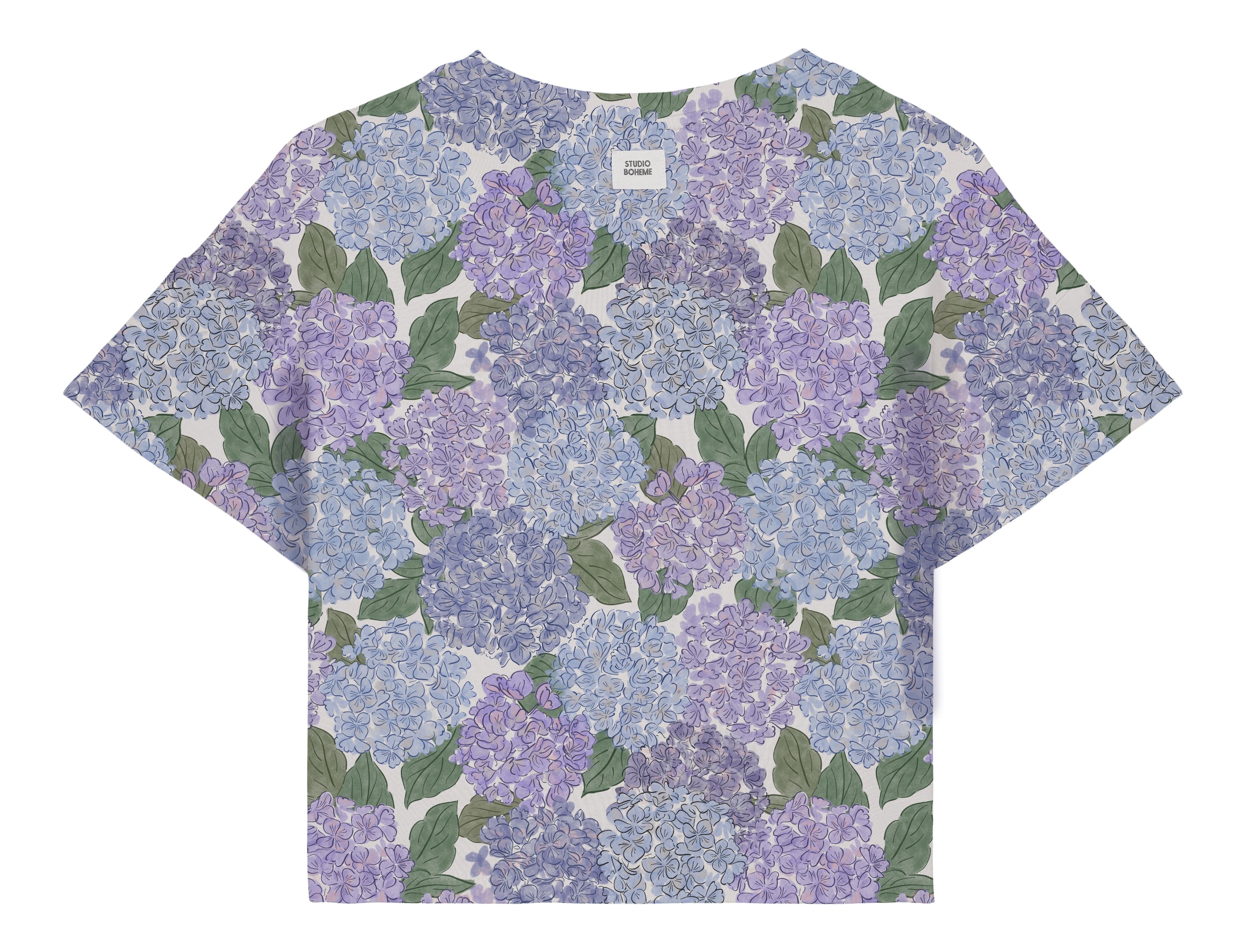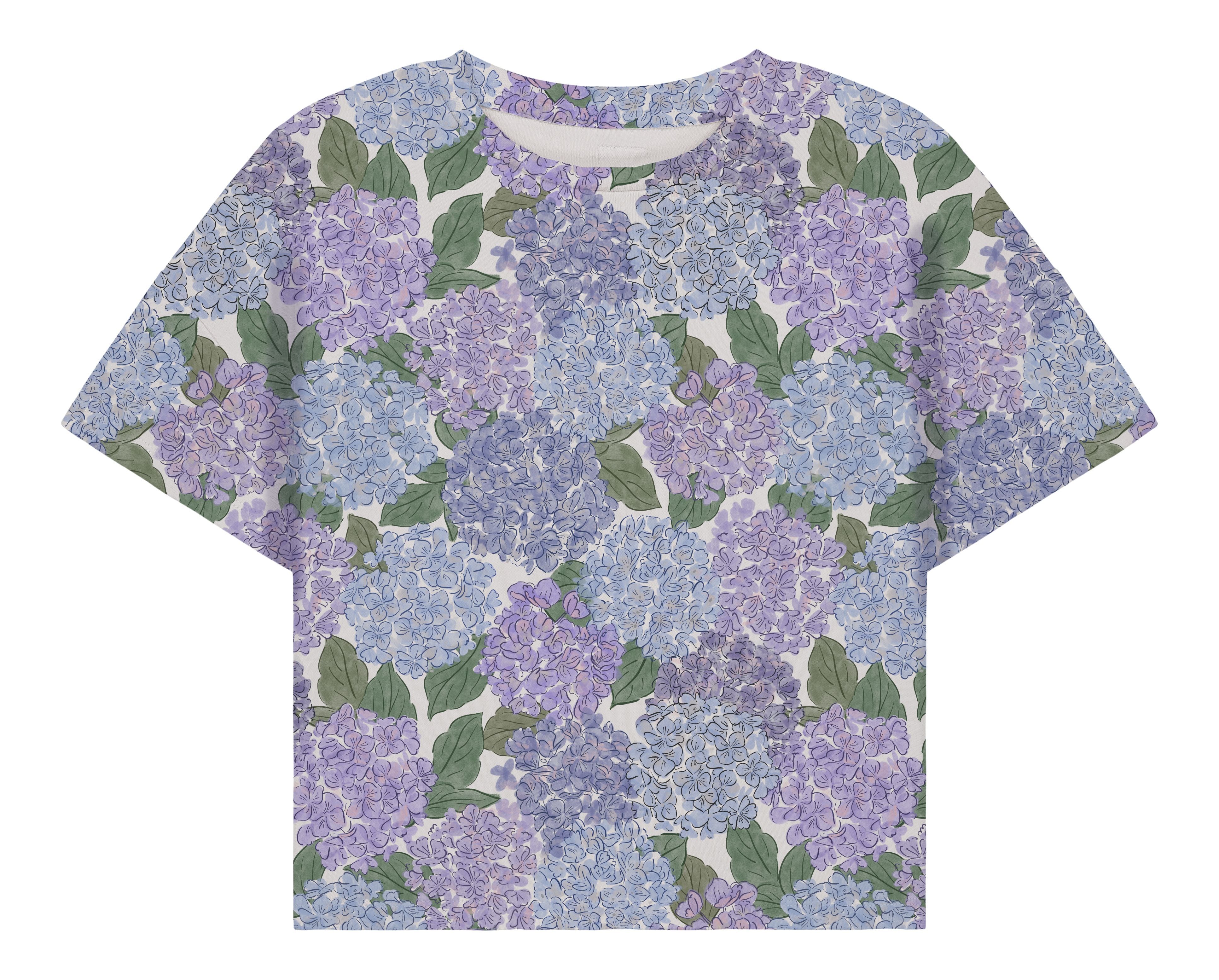 ワイドシルエット、ショート丈の新シルエットでボトムスとのコーデがしやすいTシャツです。今シーズン限定の紫陽花の総柄もかわいいですよ。