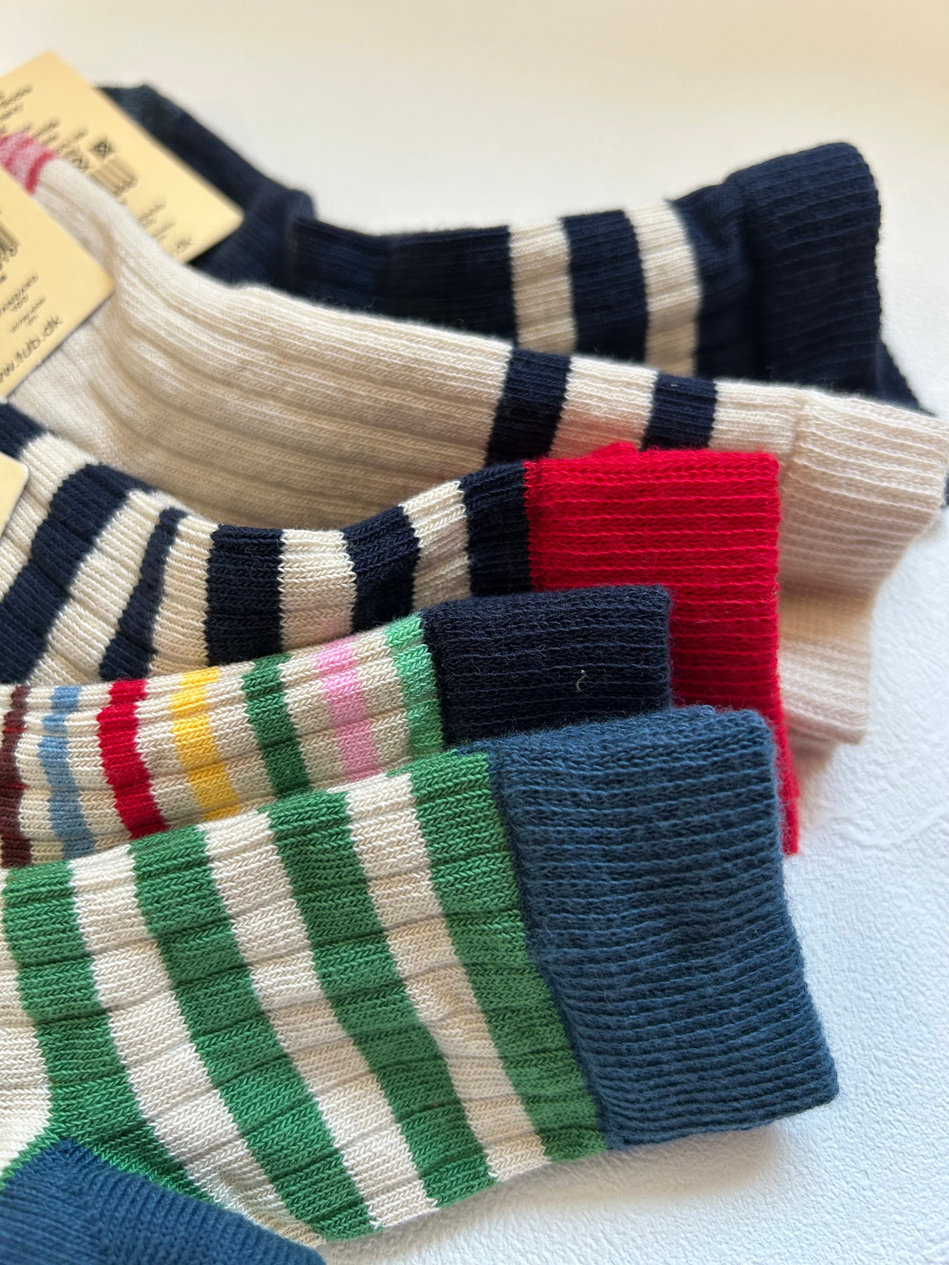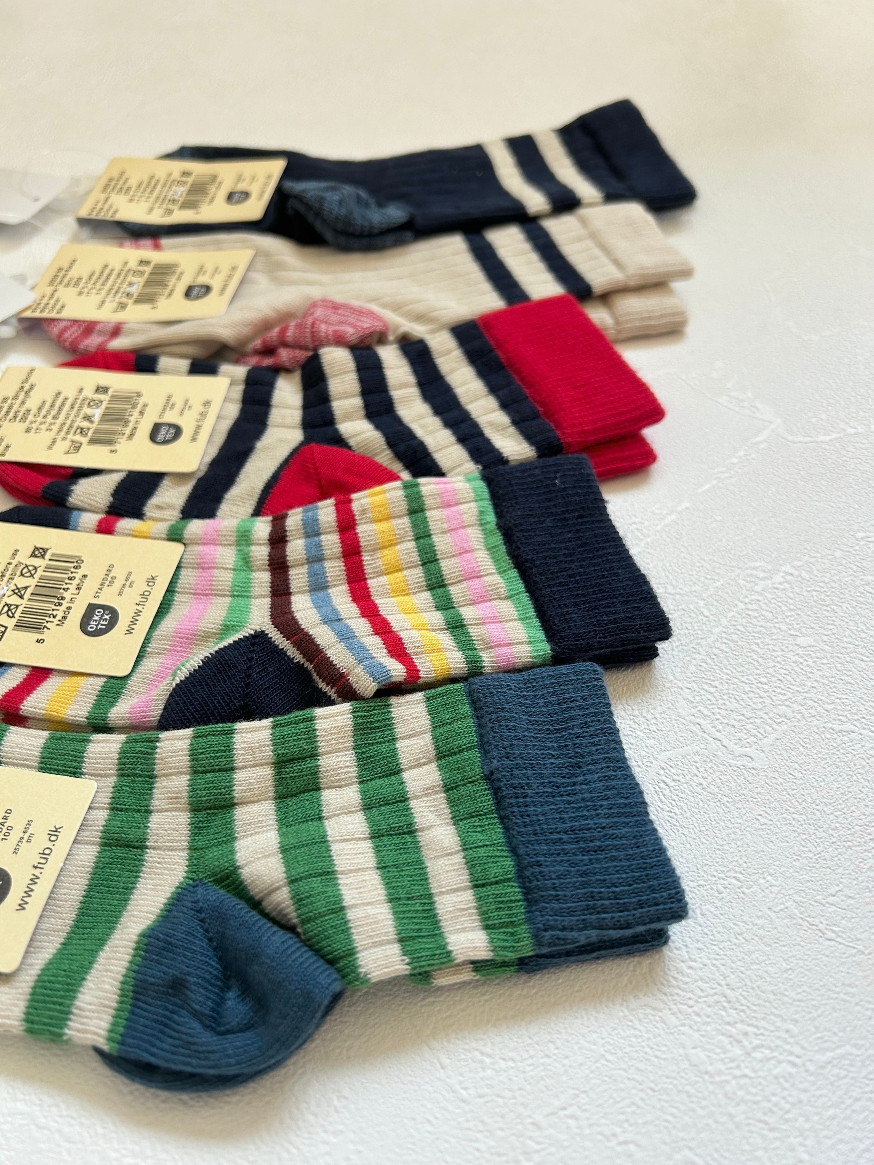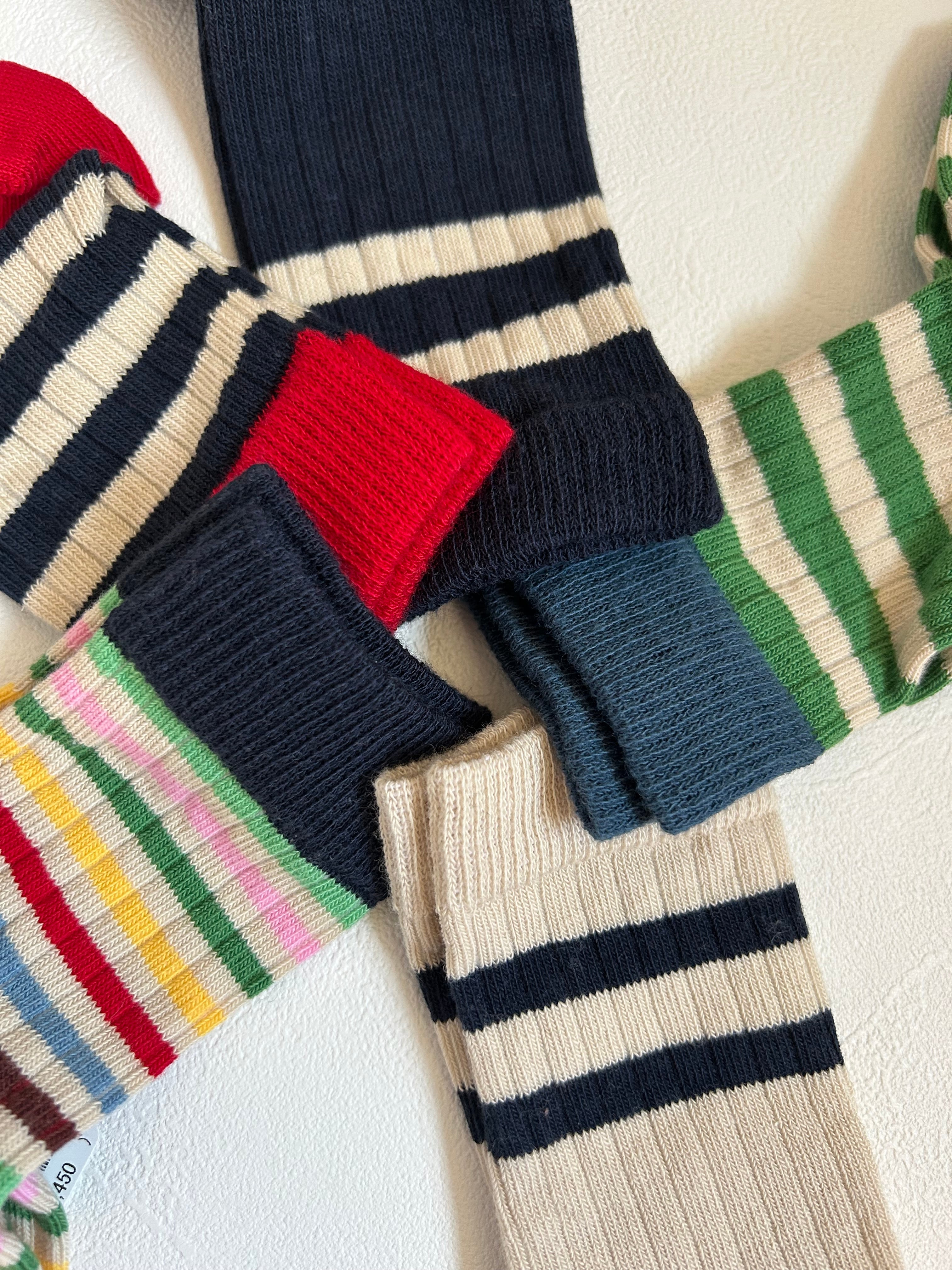 コットンニットの靴下。クラシックなリブ質感とボーダーが足元のアクセントとなります。ダークネイビーのボーダーと、踵とつま先、履き口には鮮やかなレッドを施したデザインが特徴です。シンプルながらも細やかなカラーバランスがコーディネートを引き立ててくれます。