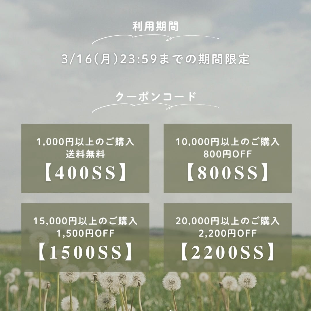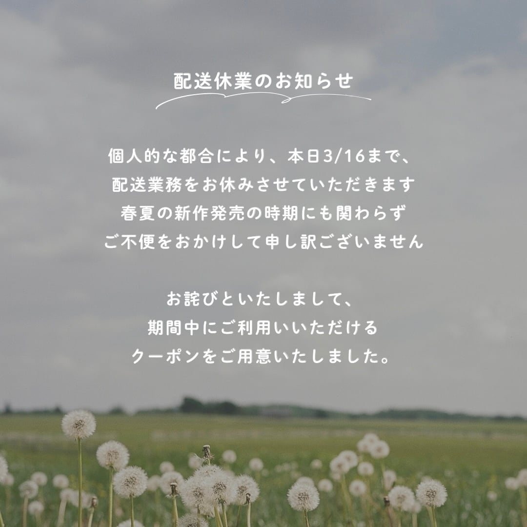 3/16(月)まで配送業務をお休みさせていただきます。春夏の新作発売のタイミングにも関わらずご不便をおかけして申し訳ございません