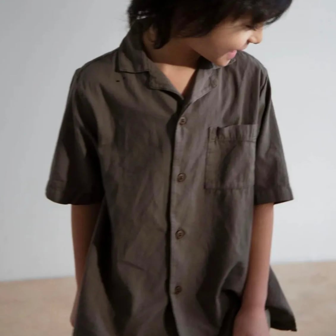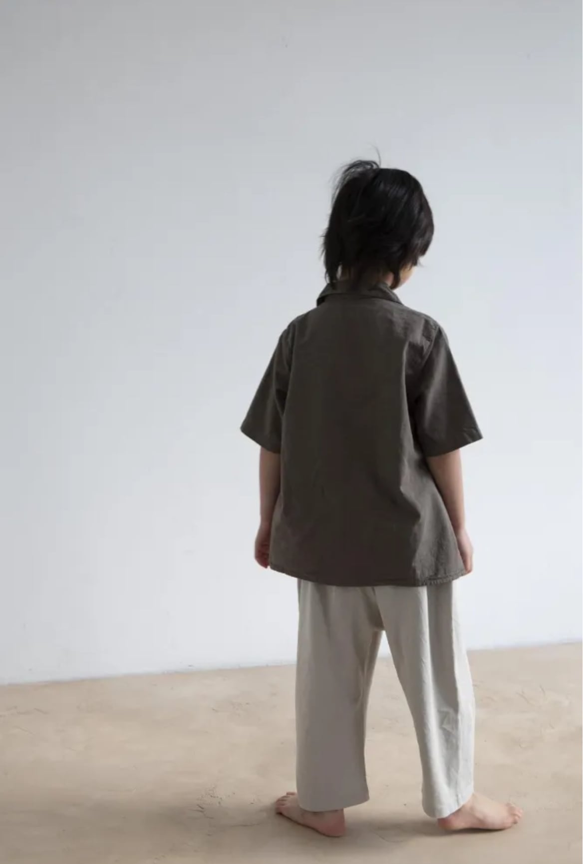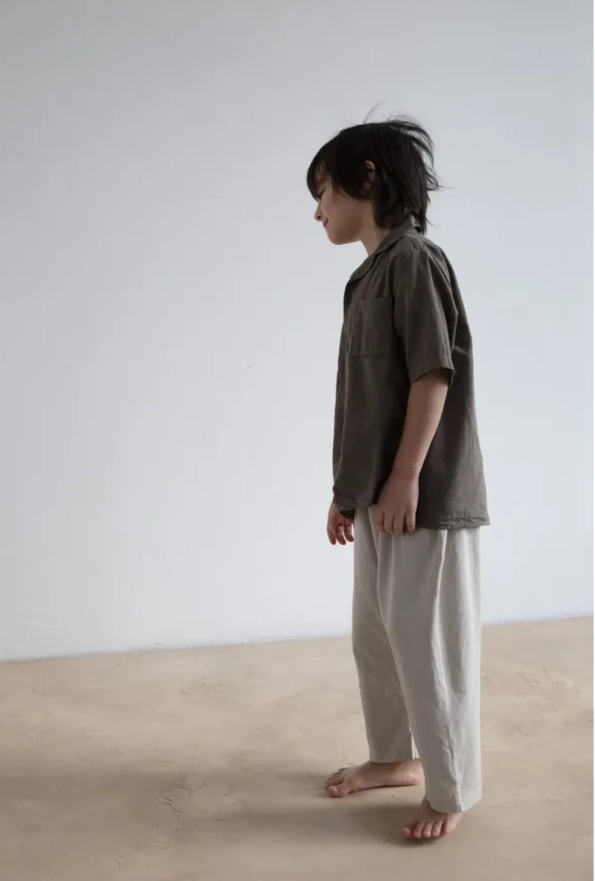 とても柔らかいオーガニックコットンの製品染めシャツです。ボクシーでゆったりとしたリラックスシルエットが素敵です。お子様が長年着用できるように計算されているので月齢通りでお選びいただいてもゆったりとしたシルエットとなります。